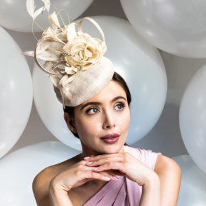 This is a beautiful piece of millinery. A striking large disc with fabulous feathers, flower and sculptural quills. This disc will certainly ‘make an entrance’.